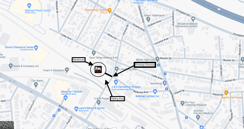 The PM Press warehouse is just off a major highway (NY-17/I-86) and very close to the I-86/NY-17 and I-81 interchange. NYC, Philadelphia, and Buffalo are all about 3.5 hours away. Boston and Washington DC are about 4.5 hours. Cleveland is 5.5 hours driving time.