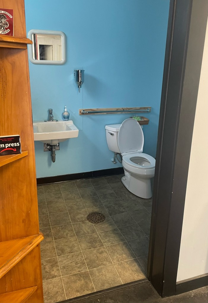 We have two bathrooms inside the warehouse with 29″ doorways (Picture #1 – we’ll be moving that shelf before the event). One of them is currently equipped with handrails.